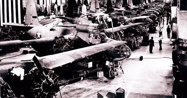 Американската автомобилна индустрия претърпя дълбоки трансформации. Chrysler произвежда фюзелажи за самолети вместо автомобили. General Motors произвежда двигатели за изтребители и бомбардировачи, зенитни оръдия, камиони и танкове. Packard произвежда двигатели Rolls-Royce за британските военновъздушни сили. А Ford Motor достави на въоръжените сили бомбардировачи с голям обсег B-24 Liberator.