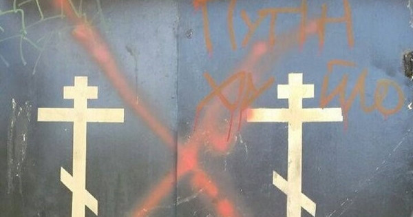 Жарық көрген фотосуретте «Путин ху*ло» деген жазу, сондай-ақ қызыл бояумен айқасқан ғибадатхананың есіктері көрсетілген.