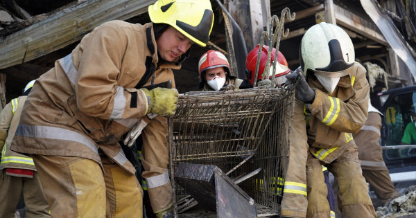 Ratownicy znaleźli 6 nowych fragmentów ciała pod gruzami zniszczonego przez Rosjan centrum handlowego Amstor w Krzemieńczuku.