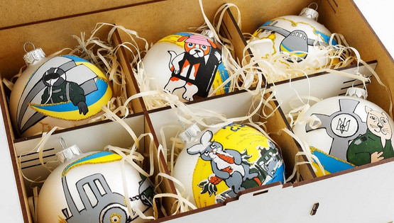 Igračke „Božićna umetnost Ukrajine“ prave se u fabrici ukrašavanja božićnih jelki u Ivano-Frankivsku, a kutije – u Khmelnytskyi. Komplet sadrži 6 staklenih kuglica, ručno ofarbane i spakovane u drvenu kutiju. Napravljeno je ukupno 500 kompleta ukrasa za božićnu jelku, koje preduzetnici nadaju da će prodati tokom praznične sezone. 10 odsto profita usmereno je na potrebe Oružanih snaga Ukrajine. Kuglice se mogu naručiti unutra Instagram, kao i direktno u Sofiji u Facebook.