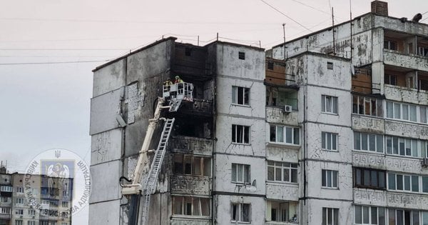 Oko 06:10, gradonačelnik Kijeva Vitalij Kličko Prijavio o pozivanju medicinskih službi u Svjatoshinski okrug grada. Prema njegovim rečima, olupina oborenog napadačkog drona pala je na jednu od visokih zgrada i izazvala požar. Šef Gradske vojne uprave u Kijevu Serhij Popko Razjašnjeno, najviši spratovi stambene zgrade od 16 spratova zapalili su se.